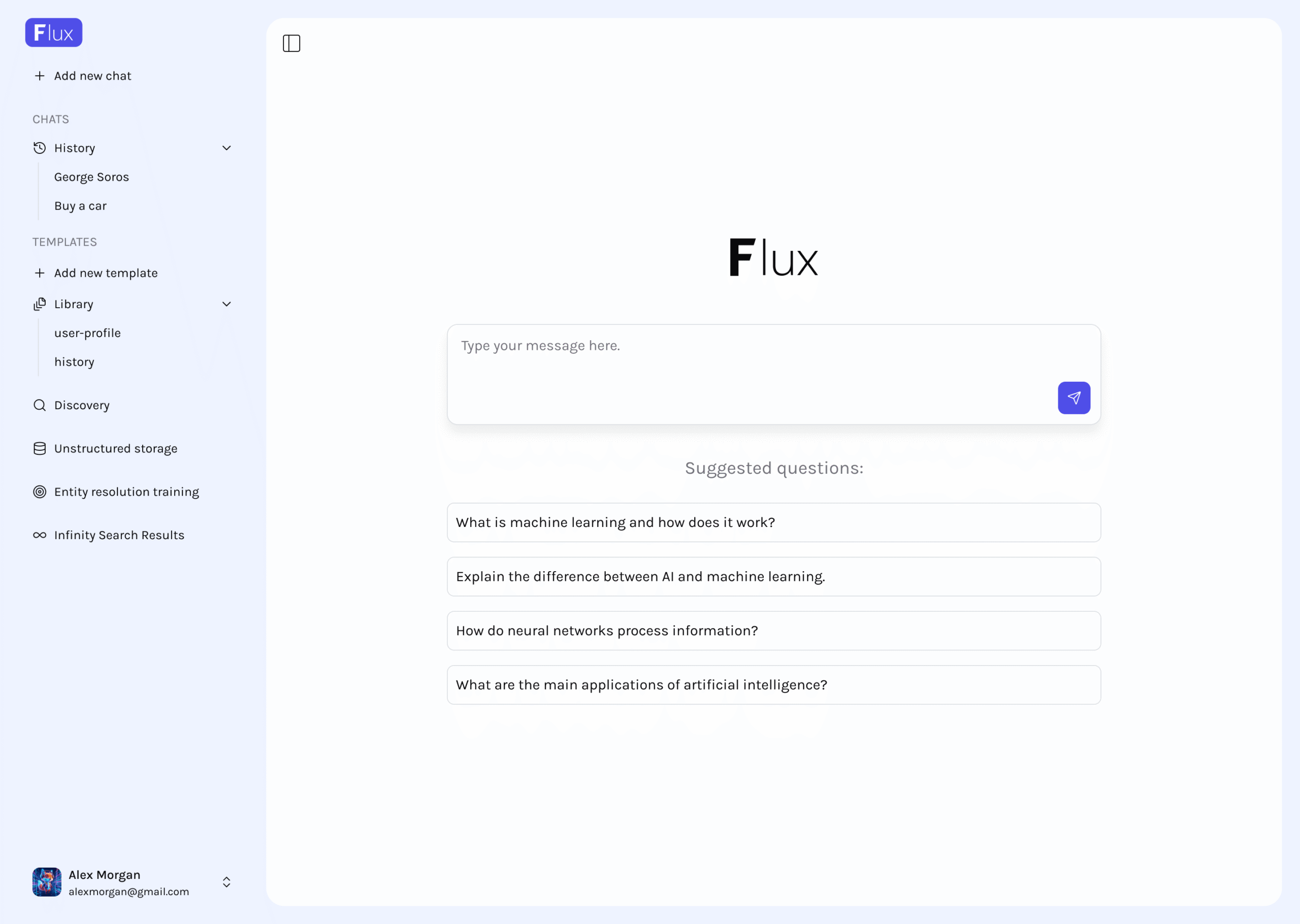 Flux unifies data from diverse sources into a single, structured knowledge system. By normalizing and enriching information through a shared glossary, taxonomy, and entity resolution, the platform creates consistent and reliable context. Using RAG pipelines and graph-based modeling, Flux reveals relationships between entities and enables deep, contextual research through a conversational interface – all within one seamless workflow.